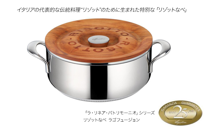 イタリアの家庭料理の中で、パスタと並んで愛されているのはリゾット。そのリゾットを特別おいしく仕上げるリゾット専用鍋が、ラゴスティーナの「リゾットなべ ラゴフュージョン」です。美味しいリゾットのポイントは、歯ごたえのあるアル・デンテであること。「リゾットなべ ラゴフュージョン」の本体は、耐久性と熱伝導に優れたアルミニウムとステンレスの“全面3層構造”を採用。アルミニウムの優れた熱伝導で底面から側面まで均一に熱が伝わり、ステンレスがしっかりと調理中の熱を保つワンランク上の構造です。