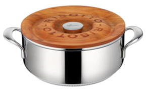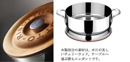 「リゾットなべ ラゴフュージョン」のふたは、上面に木、下面にステンレスを使用した二重構造。調理後のリゾットを取り分けるまで、熱々に保ちます(注2)。テーブルにサーブするときはふたを裏返し、エレガントな鍋敷きとしても使えます。熱々のリゾットを作るために様々な工夫を凝らした特別なリゾット専用の鍋で、イタリア伝統の味をお楽しみください。