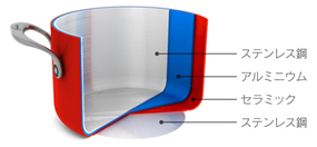 鍋本体は、保温性と耐久性に優れたステンレス鋼に熱伝導に優れたアルミニウムと赤いセラミック加工を重ねたマルチレイヤー構造。アルミニウムは4mmと厚く、熱伝導が抜群です。