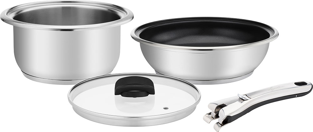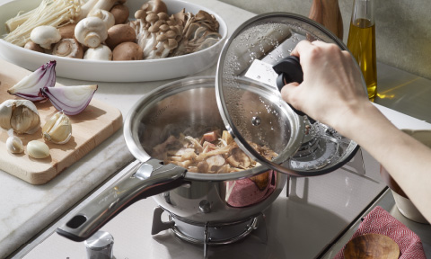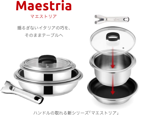 「マエストリア」は、美しいステンレス製の鍋・フライパンに着脱式ハンドルを採用し、省スペースの収納を可能にした、ハンドルの取れる新シリーズです。