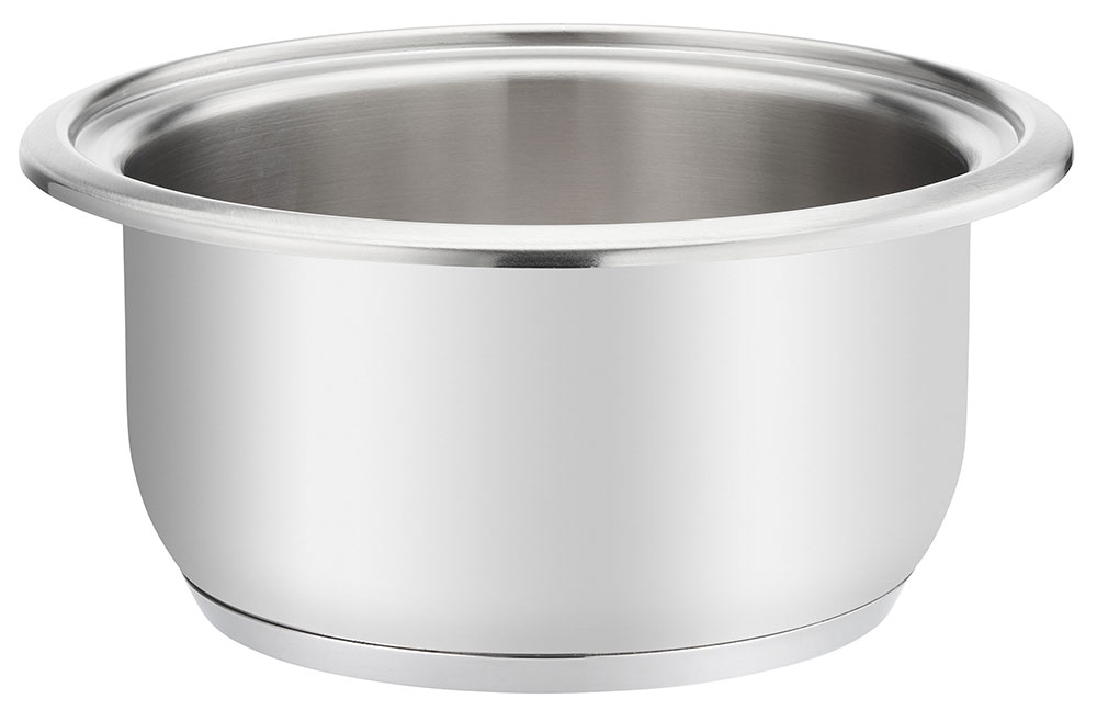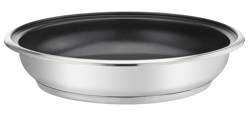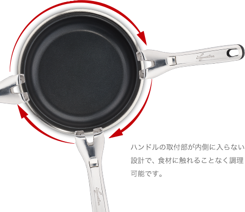 外面は輝きのある鏡面仕上げ、内面はマット仕上げ(ソースパンのみ)で傷が目立ちにくく、いつまでもきれいなまま。ハンドル着脱用のタブがないので、そのままお皿やボウルとして食卓に置けるデザインです。