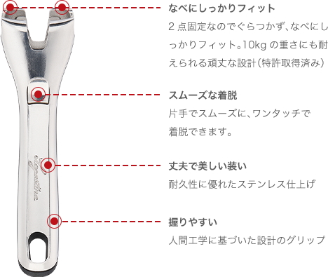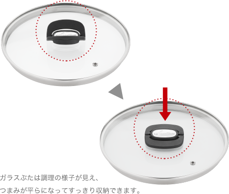 独自の“360°ハードグリップ”ハンドルは、鍋・フライパン両方とも、360°どこからでも取り付け・取り外しが自由に可能。取り付け後のハンドルは10kgの重さにも耐える、ぐらつきのない抜群の安定性を保ちます。またガラスぶたは、鍋・フライパンの全サイズに合わせて揃っており、つまみ部分は平らにすることができます。ハンドルを外し、つまみを平らにすれば、すっきりと収納できます。