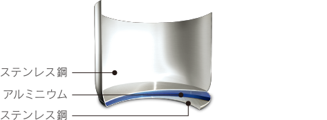 底面は熱伝導に優れたアルミニウムの上下を、耐久性に優れ美しい輝きを持つステンレス鋼で完全に包み込んだ本格3層構造。熱ムラがなく料理を美味しく仕上げます。