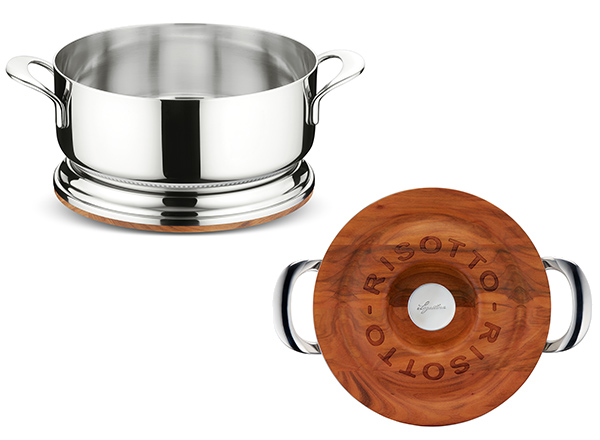上面に木、下面にステンレスを組み合わせた二重構造で抜群の保温性を発揮。鍋の中のリゾットを熱々に保ちます。